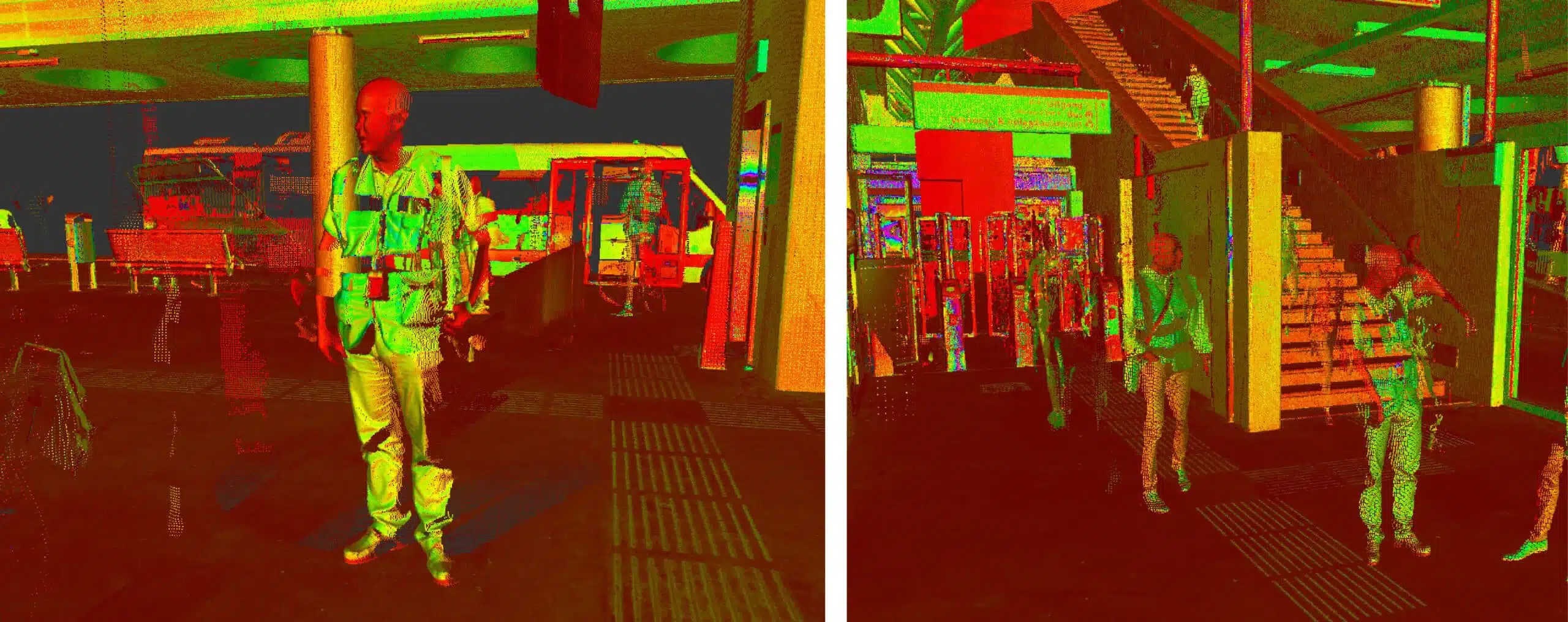 Zie hieronder een pointcloud gegenereerde afbeelding van onze collega’s Sham en Raymond tijdens hun werkzaamheden aan het RET metrostation Spijkenisse Centrum. Bureau Bouwkunde heeft voor deze renovatie, met de pointcloud van het oude station als basis, de bouwkundige uitwerking in BIM verzorgd.