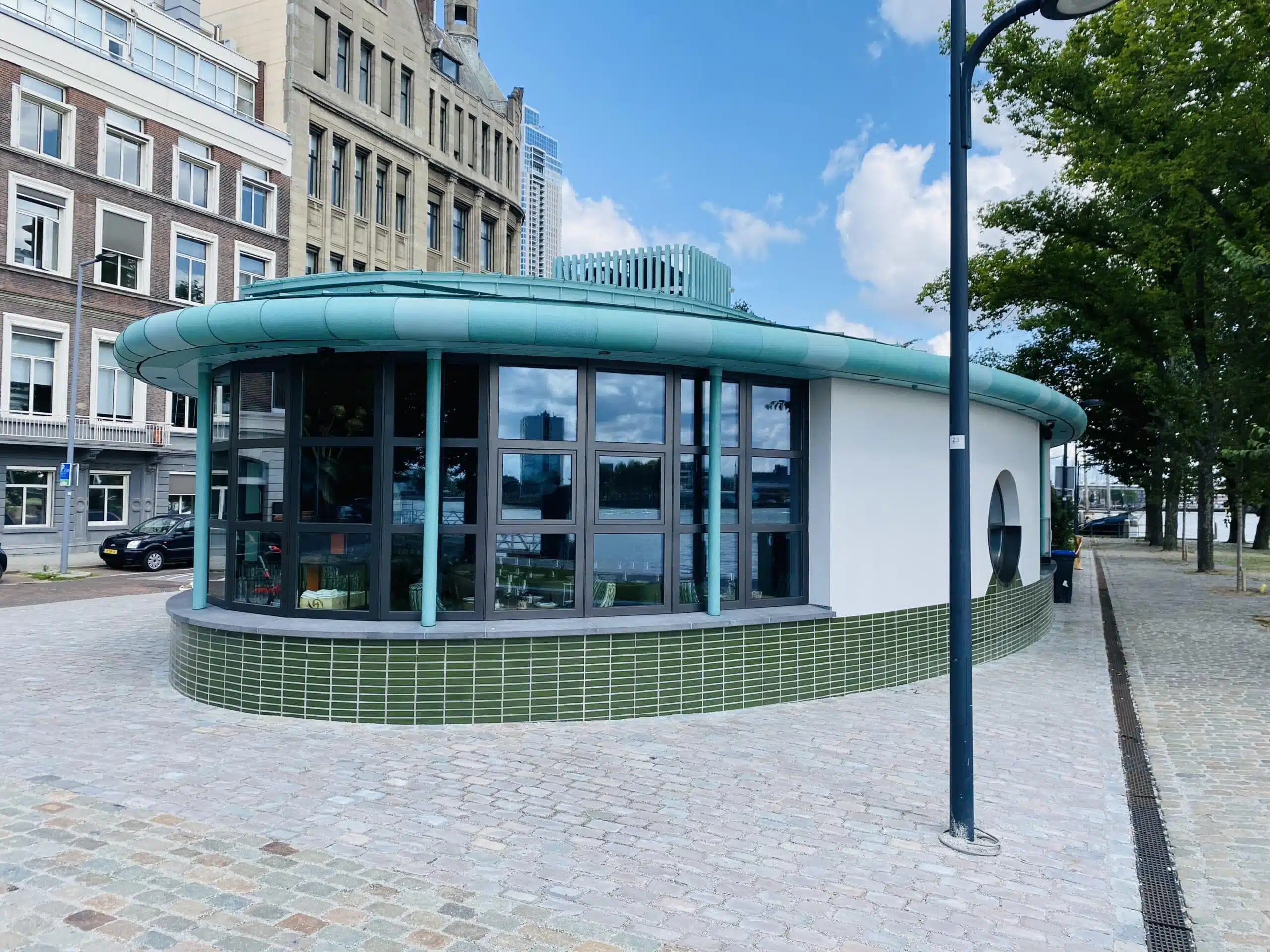 Verder richting zuiden. Ik maak een kleine omweg over de Westerkade, waar Paviljoen Kooren gevestigd is op een prachtige plek met uitzicht over het water. Het paviljoen is eerder dit jaar in gebruik genomen en huisvest onder meer kantoorruimten en restaurant de River Bar. Het is er goed toeven op een mooie dag.