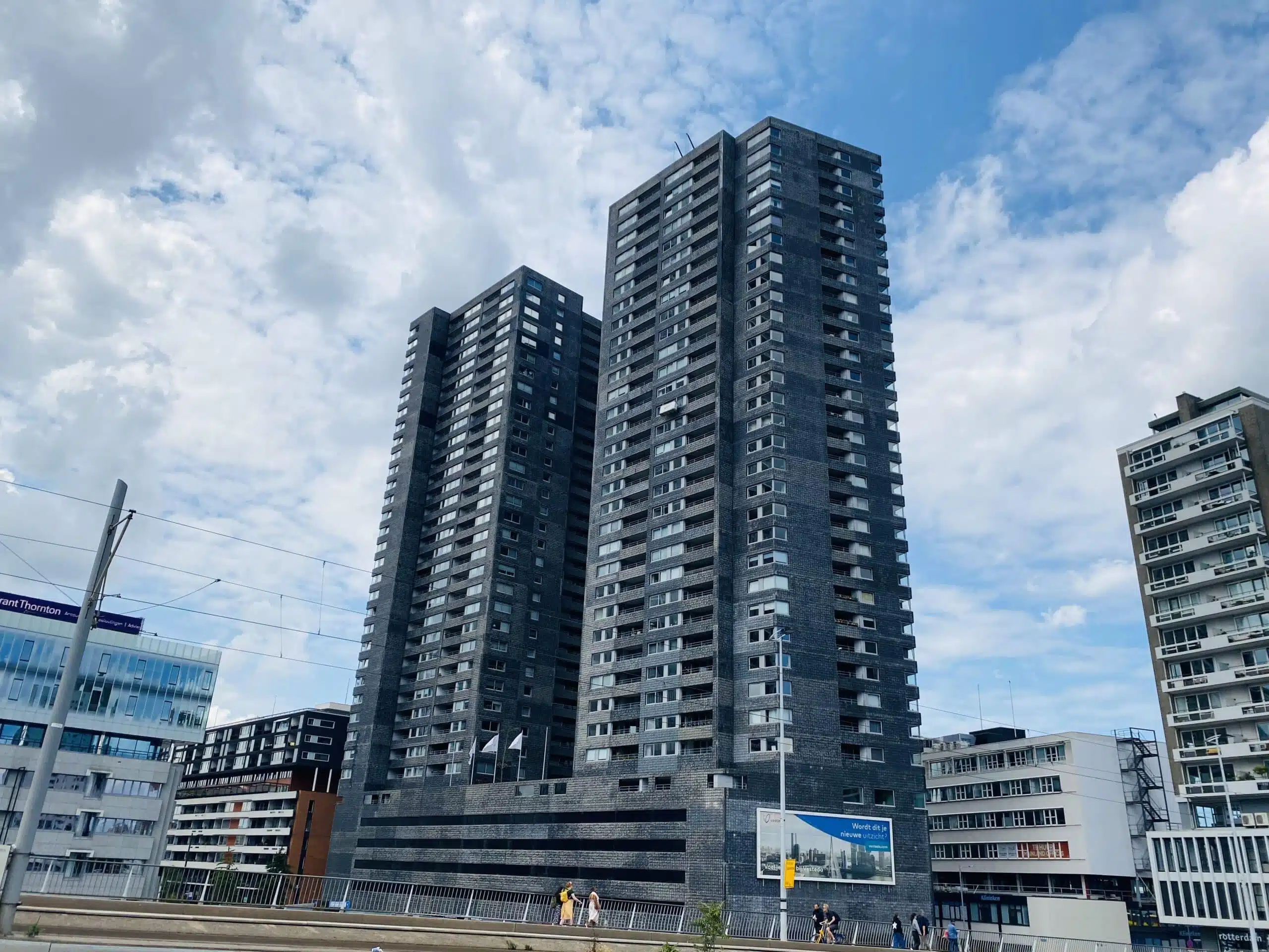 Langs het water fiets ik richting de Erasmusbrug. Al op afstand zijn de woongebouwen ‘De Hoge Heren’ te zien, gerealiseerd in het millenniumjaar 2000. Hoewel er sindsdien veel hoogbouw aan de skyline van Rotterdam is toegevoegd blijft het een indrukwekkend gezicht. Een onderbouw van zes lagen, met allerlei voorzieningen voor de bewoners. Daarboven twee woontorens van 102 meter hoog.