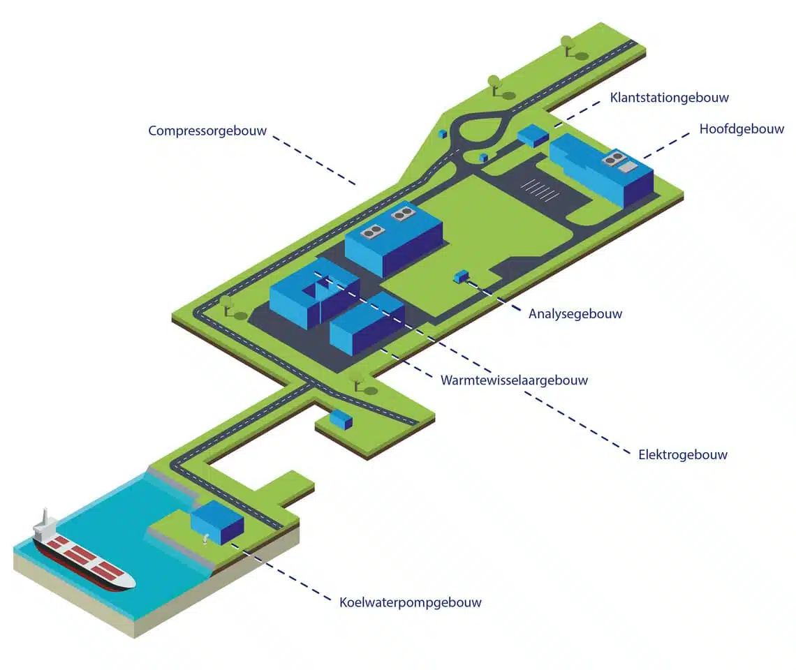 Onderdeel van dit project is een koelwaterpompgebouw met bijbehorende combiwand, gesitueerd in de nabijheid van het compressorterrein op de Maasvlakte. Voor de realisatie van dit gebouw werken zo’n 20 adviseurs en leveranciers samen in één BIM model, waardoor BIM coördinatie en clashcontroles complex en uitdagend zijn. Goede integrale afstemming is voorwaarde voor het succes van de samenwerking. Op verzoek van aannemingsbedrijf Van der Ven nemen wij deze BIM coördinatie voor ons rekening en verzorgen daarnaast de bouwkundige uitwerking in de UO fase.