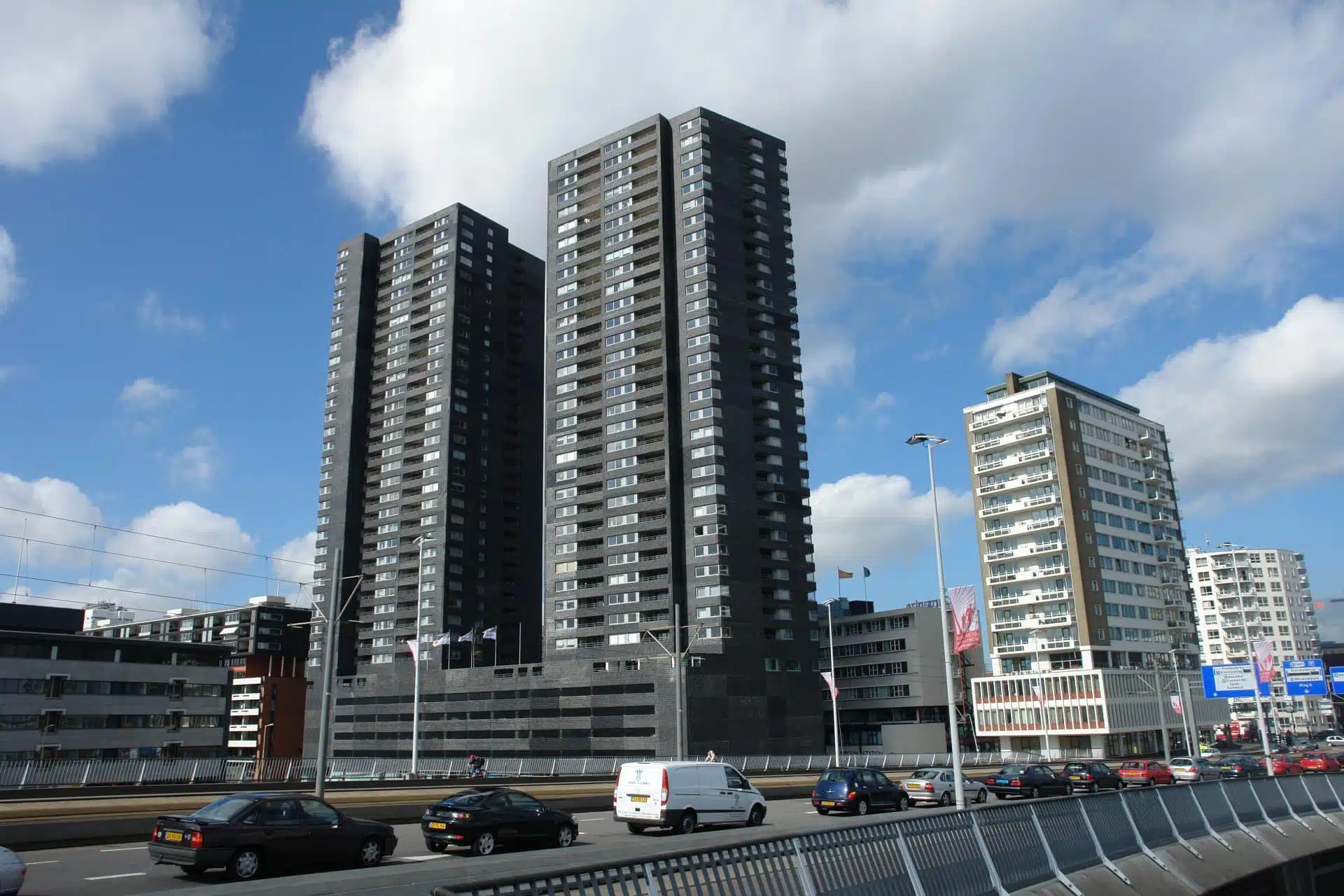 Aan de voet van de Erasmusbrug, in het Scheepvaartkwartier, staan de woongebouwen “De Hoge Heren”. Het complex bestaat uit een onderbouw van zes lagen met daarboven twee woontorens van 102 meter hoogte. Hierin zijn 290 woningen gerealiseerd. In de onderbouw zijn voorzieningen als een parkeergarage, kantoorruimte, horeca, een zwembad, sauna en fitnessruimte ondergebracht. De ene toren is rechthoekig, terwijl de vorm van de toren aan de zijde van het kruispunt van de Coolsingel met de Westzeedijk bepaald wordt door het stratenpatroon.