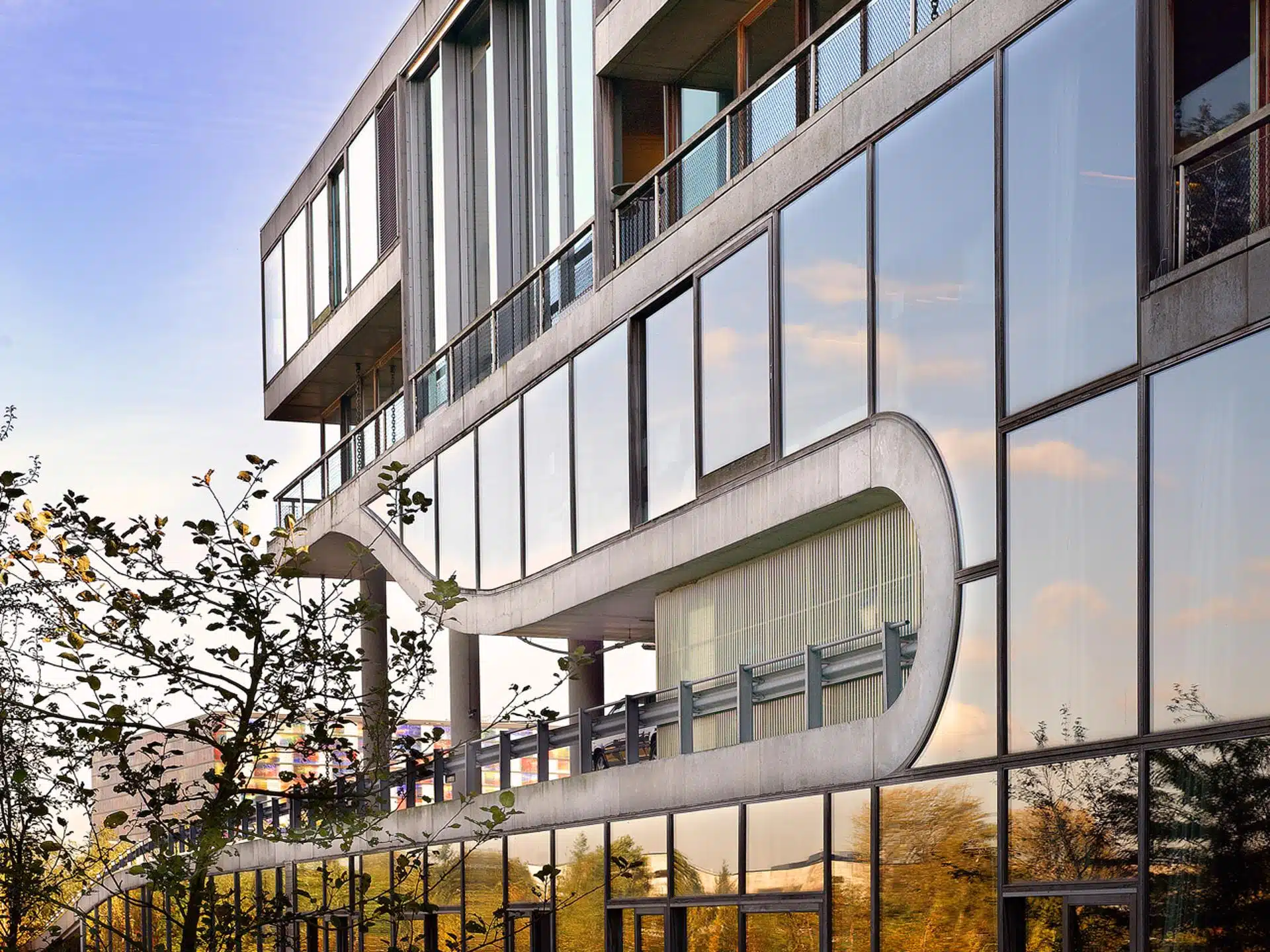 Het dak samengesteld uit onderling verspringende betonnen hellingbanen, is geheel beplant met gras en boompjes. De TV-studio’s en montagekamers zijn gesitueerd in het souterrain. De resterende ruimtes waaieren van onderen uit en variëren in grootte, hoogte en verbindingen. Trappen, trapjes, opstapjes, tussenruimtes, gangen, hellingbanen en bruggen wisselen elkaar af. Het restaurant is een grote zaal in het midden van het gebouw, die trapsgewijs is opgebouwd.